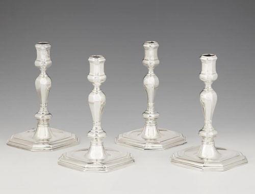 .Silver. Square base with chamfered corners; the baluster shaft with vase-shaped nozzle.