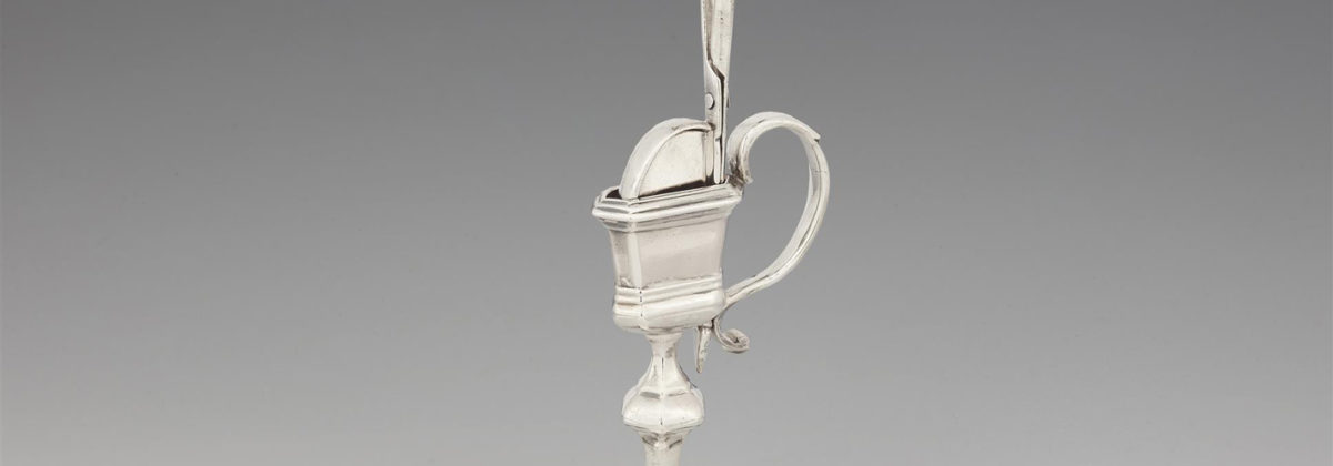 Comprised of wick scissors and stand. With a domed hexagonal base and baluster-form shaft with scroll handle and a small quiver to hold the trimmer.