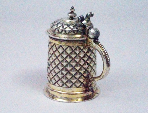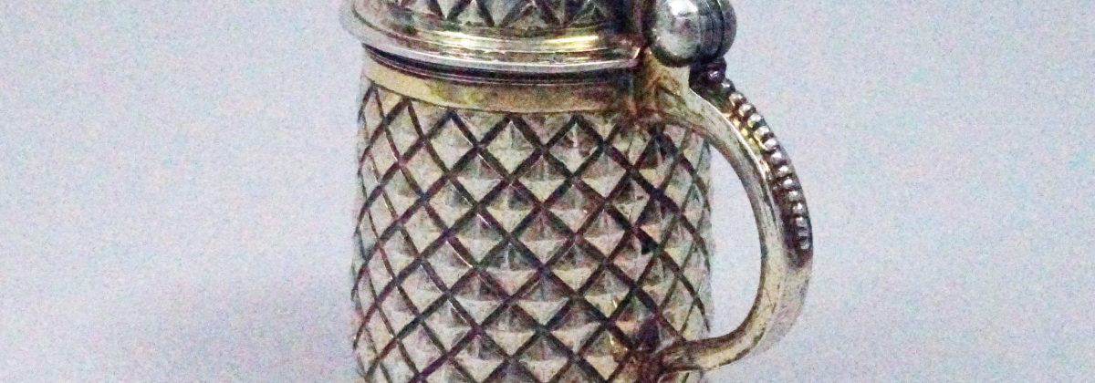 Cylindrical and on a wide foot, with mother-of-pearl decorated scroll handle and scroll thumbpiece. Body and lid hammered with diamond-shaped panels, lid with baluster knob, marked on lid and foot rim; test scratches on bottom and lid.