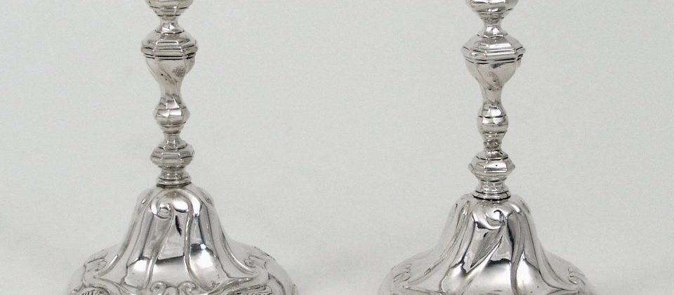 This pair of candlesticks presents an interesting Rococo example from Aurich, East Frisia. The foot has a wide, bell-shape and is profiled through eight edges. Rich moulded and chased work with naturalistic motifs as well as curved decors adorn the foot. While the bell-shaped part of the foot presents a rich decoration in twisted lines, the shaft is strictly horizontal structured. Twisted lines and balusters are its main décor. The ornamental choice of twisted lines continues also to the spout. The overall impression given is that of a movement, which has an impressive effect.