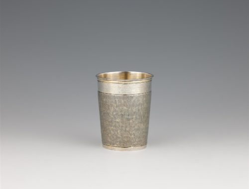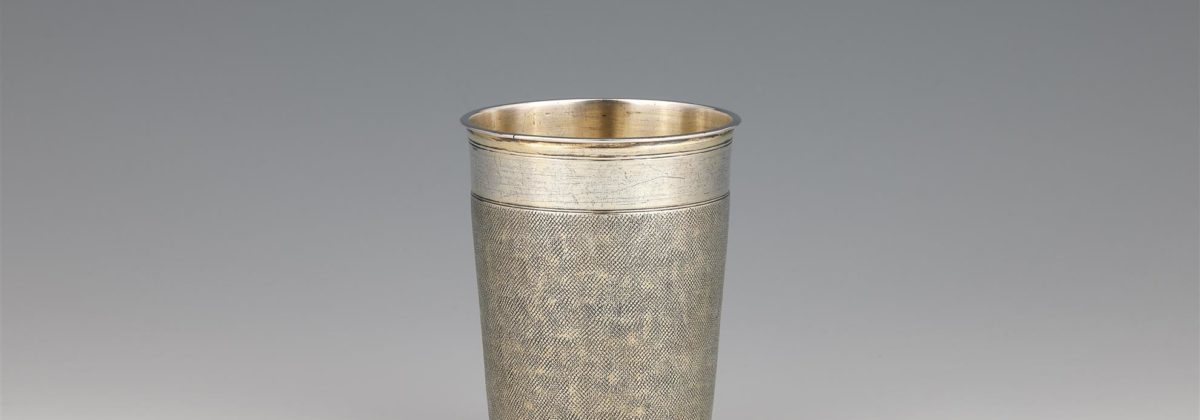 Silver, gilded. Conical cup on a flat base with a profiled lip; the body features fine snake skin puncturing.