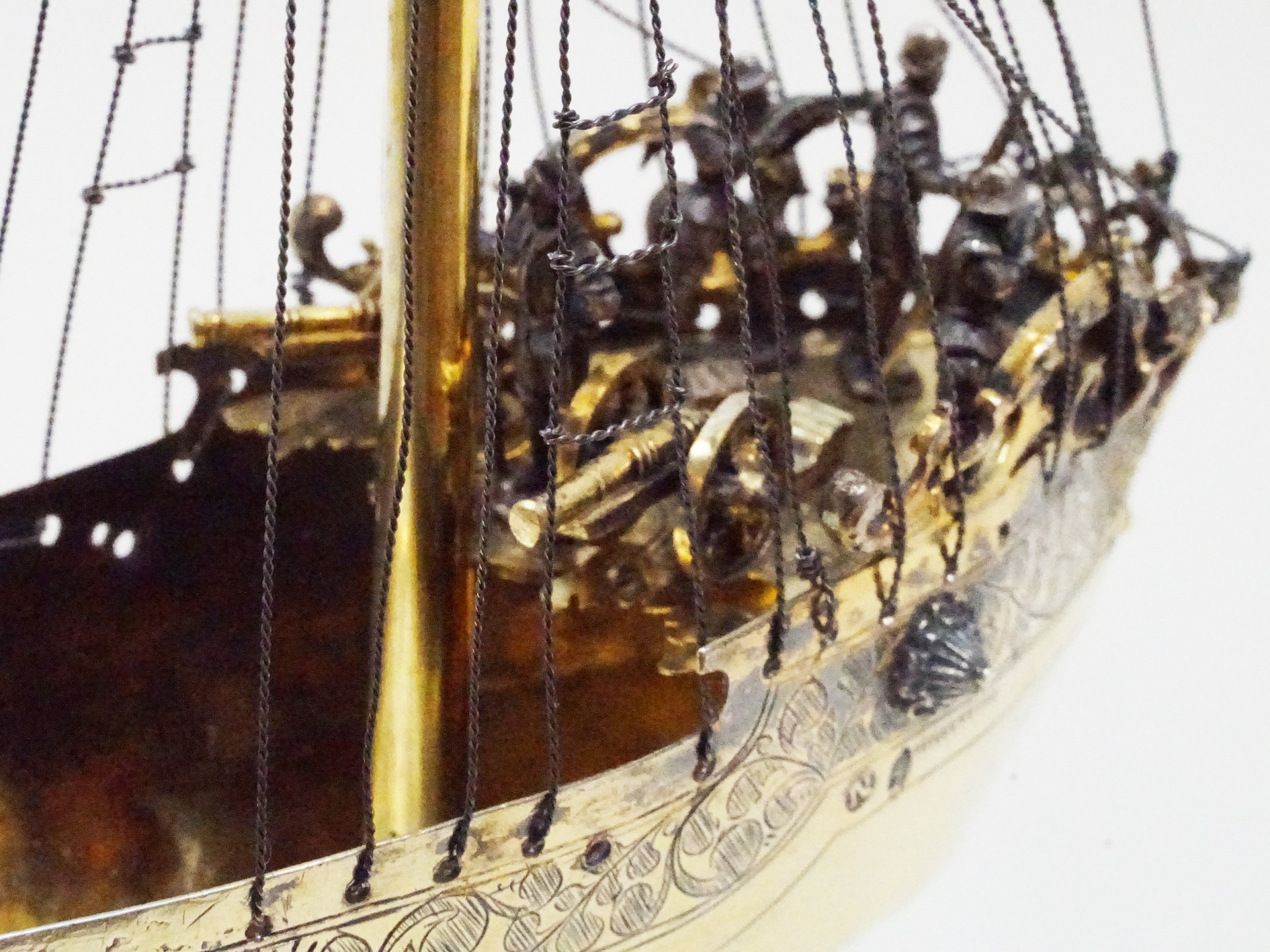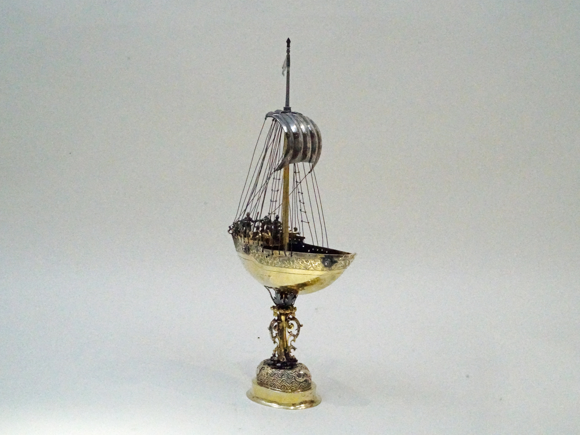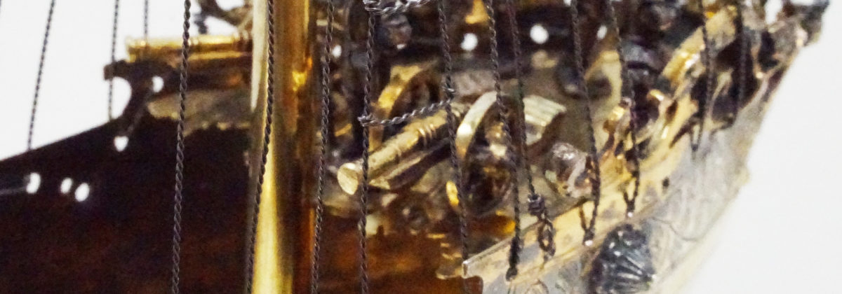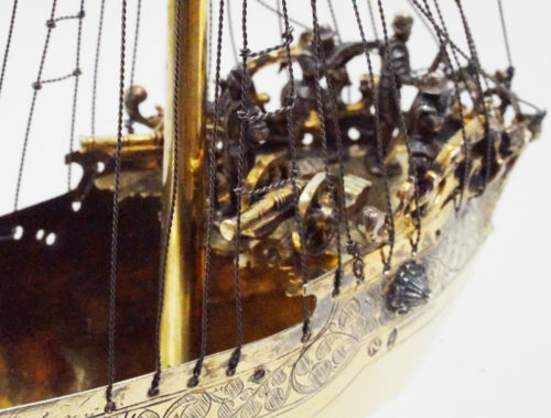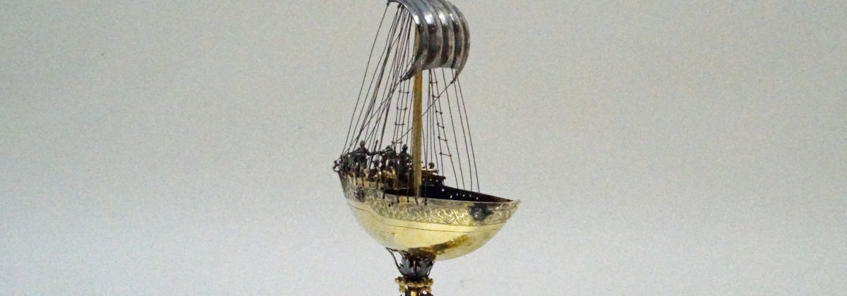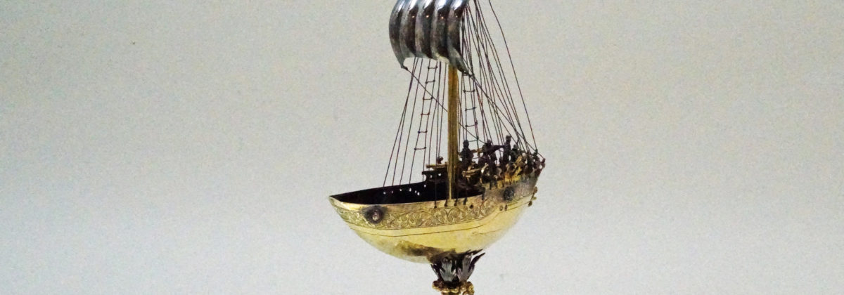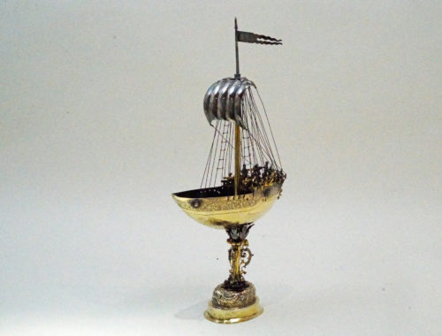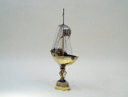 In medieval France vessels in the shape of a ship were used to store wine, spices and and as drinking cups for lords. Spiking drinks was a relatively common act in the Middle Ages, thereby using such ships assisted in assuring the Lord/drinker that their food and drink were free of poison. Ship-shaped implements were also used in a religious context (e.g., as a censer). These served as a symbol of the Church and of God for man’s salvation. There are also reports of ships being made from silver and other precious materials, which were brought to the church as votive offerings for a safe return from a perilous voyage. For example, Margaret of Provence (1221-1295), a nef of the church of Saint-Nicolas in Saint-Nicolas-de-Port in Lorraine, donated in 1254 as a token of her gratitude for the safe return of her family. In the German cultural area and in Central and Western Europe, ships have been known as drinking vessels or centerpieces since the early 16th century. On the occasion of the marriage of Wilhelm V of Bavaria to Renata of Lorraine in 1568, there were 20 salt vessels in the form of ships, all silver or silver gilded (Lehne 1985: 84). According to the latest research, they were also used as salt and spice vessels in the 17th century. The decoration of a table is certainly in the foreground when hosting a dinner, thereby such ships were placed near the most important guest at the table. Ships that do not have a spout or drinking tube served as salt vessels or were intended to represent the transport of salt, as a new archival report from Gdańsk proves. Vessels were a status symbol and were meant to symbolize the importance of a particular guest at the table. In addition, the ship is considered a symbol of a fulfilled and long life. As great centers of goldsmithing in southern Germany, Augsburg and Nuremberg also specialised in the manufacture of ships. Ships should also be considered in connection with the popularity and variety of table fountains in the 16th and 17th centuries (see Wiewelhove, 2002, pp. 91-2). The imagination and artistic/craftsmanship of the Augsburg and Nuremberg masters unfolded masterfully in this period through the manufacture of table and puzzle devices. In general, such ships were not replicas of existing ships. Rather, these were evidence of the creative imagination of the master, who used existing designs of ships – contemporary or even older – as models. Nefs were very popular luxury vessels up until the late 19th century and were often given as exceptional gifts. A very fine, historically important example in the musée des arts décoratifs in Paris shows the symbolic power of ships. For the goldsmiths in southern Germany, the key field ship (ca. 1503) (in the Germanic National Museum, Nuremberg) was probably a constant reference. This, however, was a vessel clearly made for drinking. Similar to the key fields ship, the master of the present ship has chosen to show an alarming scene in the everyday life of the ship. The ship’s crew is highly concentrated on the deck and looks into the distance. The ship represents an important moment in his life at sea. This should give the guests at a dinner an opportunity to talk about the symbolism of the ship, its origin and the craftsmanship of the master.