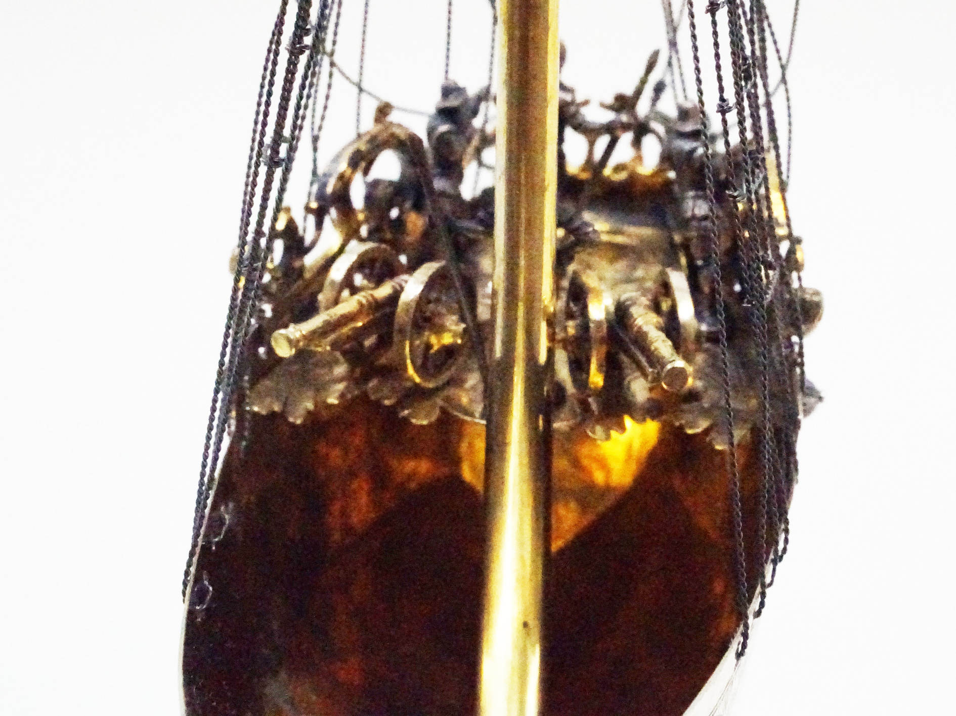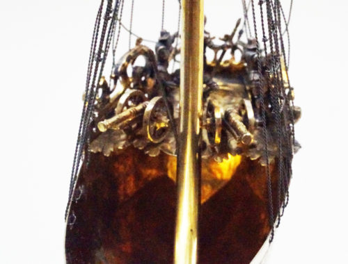Designed to function such that the ship’s belly was filled with liquid, and drunk though the drinking tuber at the ships bow. The drinker faced the challenge of dodging the defensive lance of the “Moor”, designed such as to protrude directly at the nose of the brave drinking companion. The delicate volute clasp on the stern served as a handle for the drinking vessel, which had to be lifted to drink.