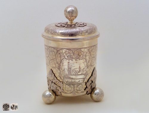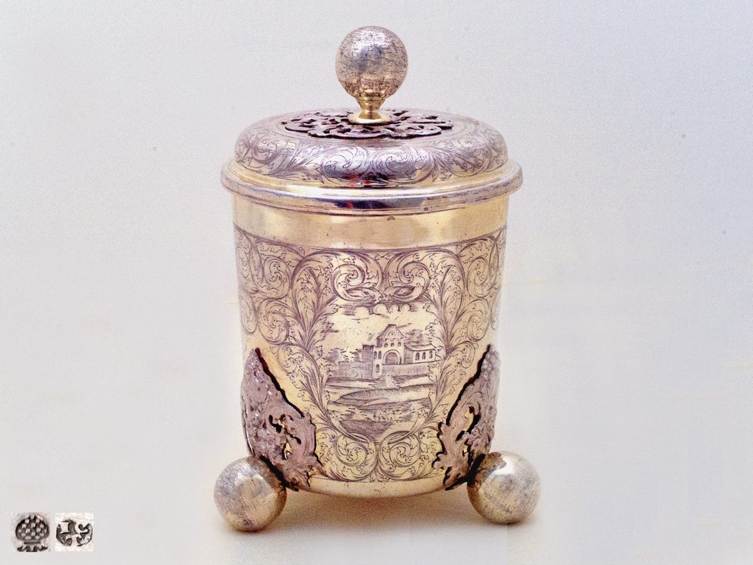 The straight body stands on three ball feet and has three engraved cartouches showing different landscapes. Among the three cartouches, the corpus is decorated with again very detailed foliage, which takes the form of acanthus leaves. The cover is detachable, profiled and also adorned with the engraving of a detailed foliage, just like on the body. Between the knob, which is a ball, and the cover, there is an element formed in open-work, richly decorated. This way of holding the ball attached on the cover is repeated on the three ball-feet: this time, the embossed element between the ball and the body is larger and conical, showing acanthus leaves, fruits and on the top grapes. The marks are ligated on the underneath side of the corpus and on the cover.