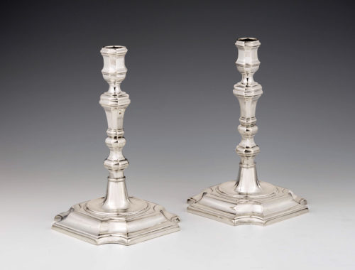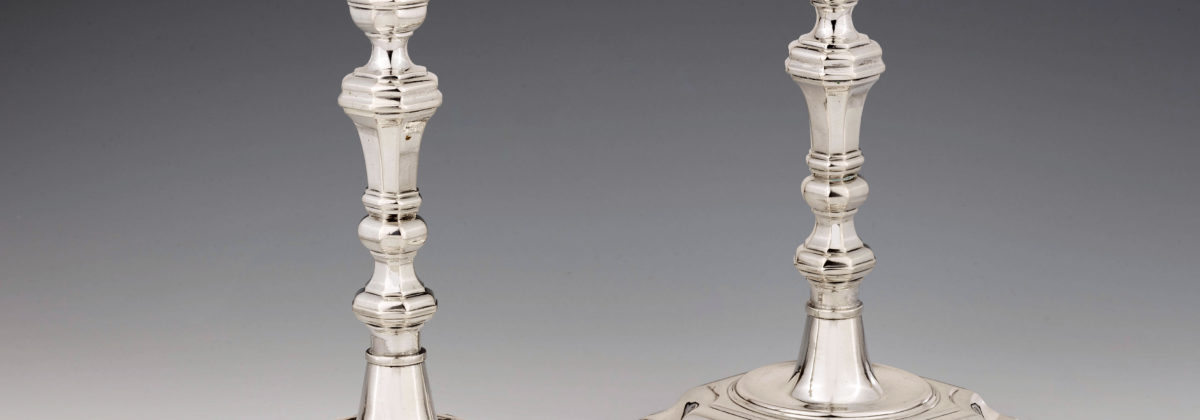 Silver. Square base with indented corners. The angularly segmented baluster shaft features a vase-shaped socket.