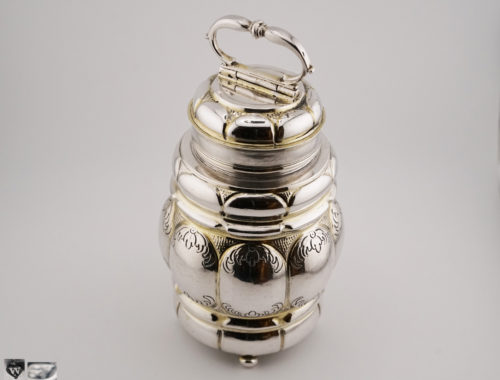 Most of the 17th century screw-top bottles preserved today are made of pewter, earthenware, and silver-mounted glass, but rarely of pure silver. In Carl Hernmarck’s “The Art of European Gold- and Silversmiths 1450–1830, Munich 1978”, no screw-on bottles are described as storage vessels. Only a few collections, for example the Germanic National Museum in Nuremberg, have silver screw-top bottles. These have not been preserved to a large extent, as they often showed signs of use due to the sensitivity of the thread on the cover and had to be melted down. The bulbous, richly decorated screw-top bottles were not used as canteens for drinks, but to store particularly valuable spices such as ginger