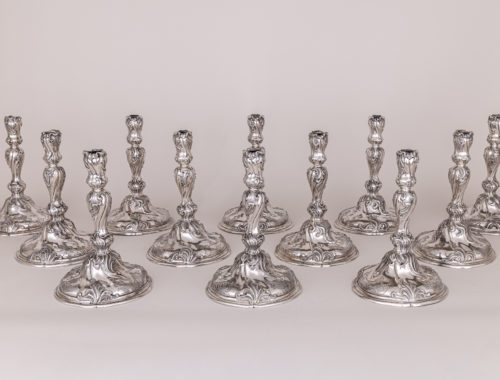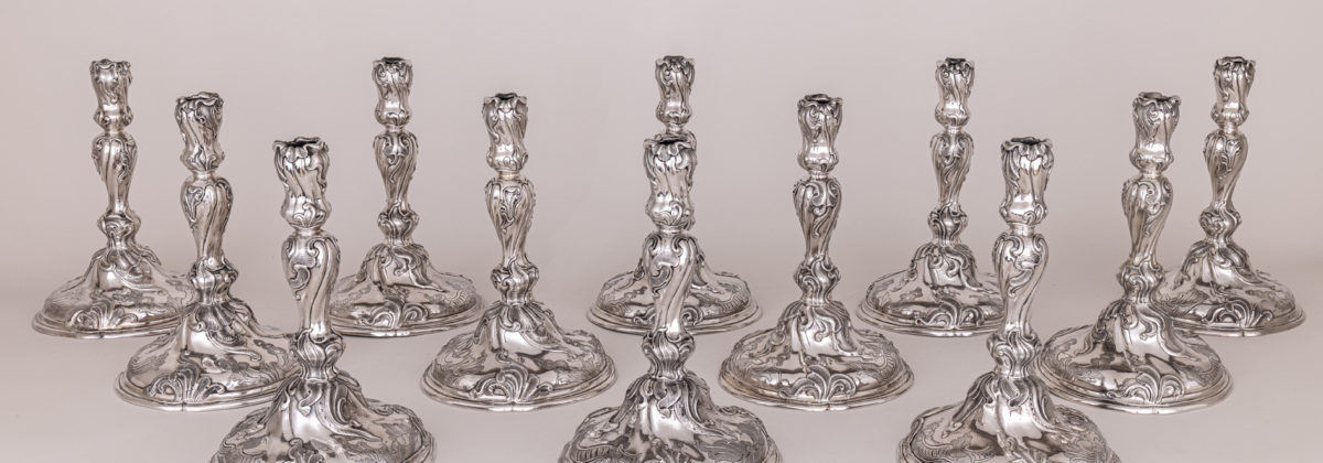 The round base is adorned with leaf ornaments, Rococo motifs and shells, which are repeated on the shaft. Each shaft is engraved with the initials ‘AR3’ and numbered 45, 46, 47, 48, 50, 51, 57, 58, 85, 86, 93 and 97, and bears the mark of the city and the silversmith No 58 without stamps