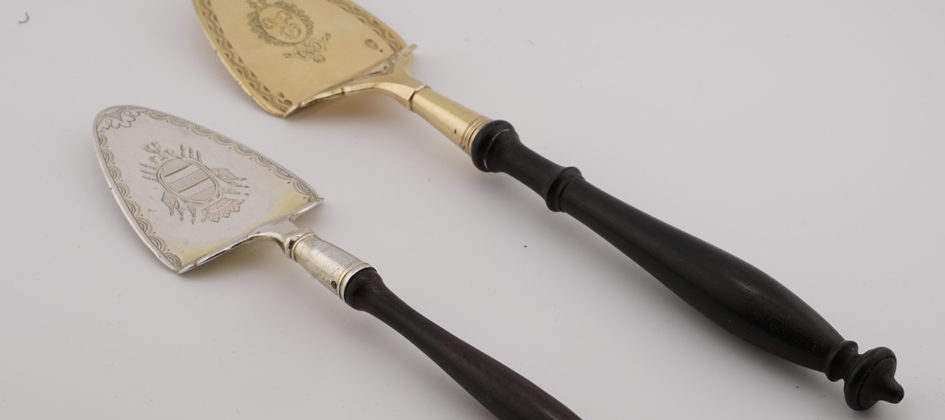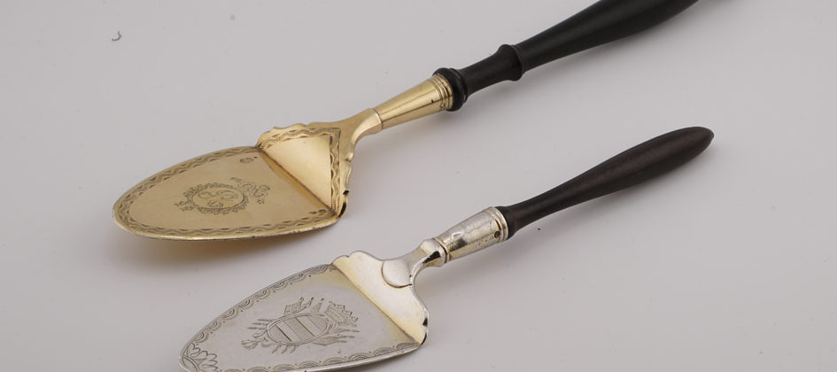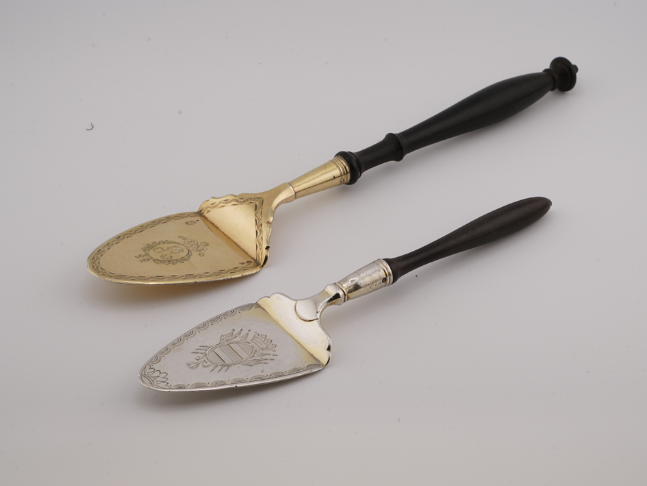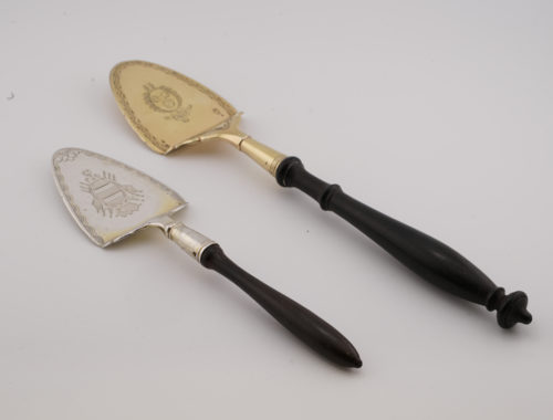 Simple, decorated with a geometric frieze, one engraved with the initial R in a floral wreath, the other engraved on the reverse with “EA,” the handles of blackened pearwood, the first with hallmarks on the bowl: recognition and master silversmith, and on the underside a small guarantee mark used from 1809 to 1819; the second with hallmarks on the underside: recognition and master silversmith; above: Foreign Works 1798–1809, large and medium Paris hallmarks, used from 1809 to 1819